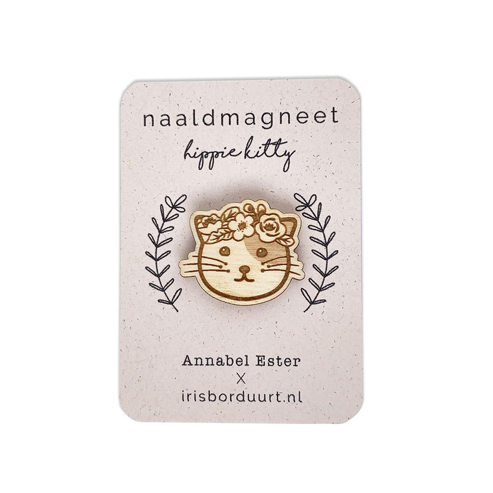 After the success of the needle magnet cactus, Annabel and I worked on two new designs. And here they are! A Hippie Doggo and Hippie Kitty: the perfect embroidery aids. The design is based on my Hippie Kitty embroidery projects, which are already hanging on many people's walls. In English, a needle magnet is also called a needle minder . But whatever you call it, it's a fantastic tool that's a must-have in your sewing kit, in my opinion. This handy little tool consists of two magnets, making it easy to "click" it onto your embroidery. The needle then clicks back onto the needle magnet. Now you'll never lose your embroidery needle again, and you won't make unnecessary holes in your fabric!Wooden needle magnet in the shape of a cat