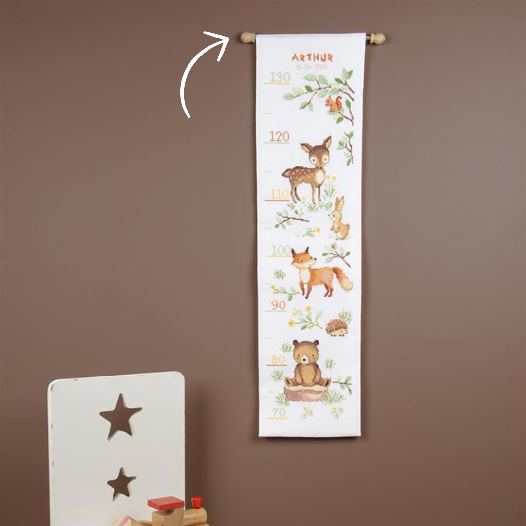 This hanging stick is for attaching your embroidery, such as a beautiful embroidered growth chart. Then tie a string to the stick for easy hanging! It can hold an embroidery up to 27 cm wide. The small beads at the ends can be slid off, so you can shorten the stick by sawing off a piece. The total width of the stick, including the small beads at the ends, is 32 cm.Features: