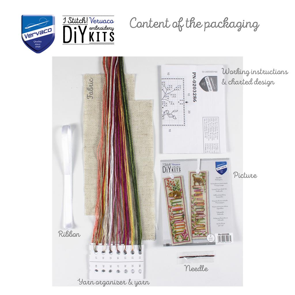 Inhoud van het Vervaco boekenlegger borduurpakket: