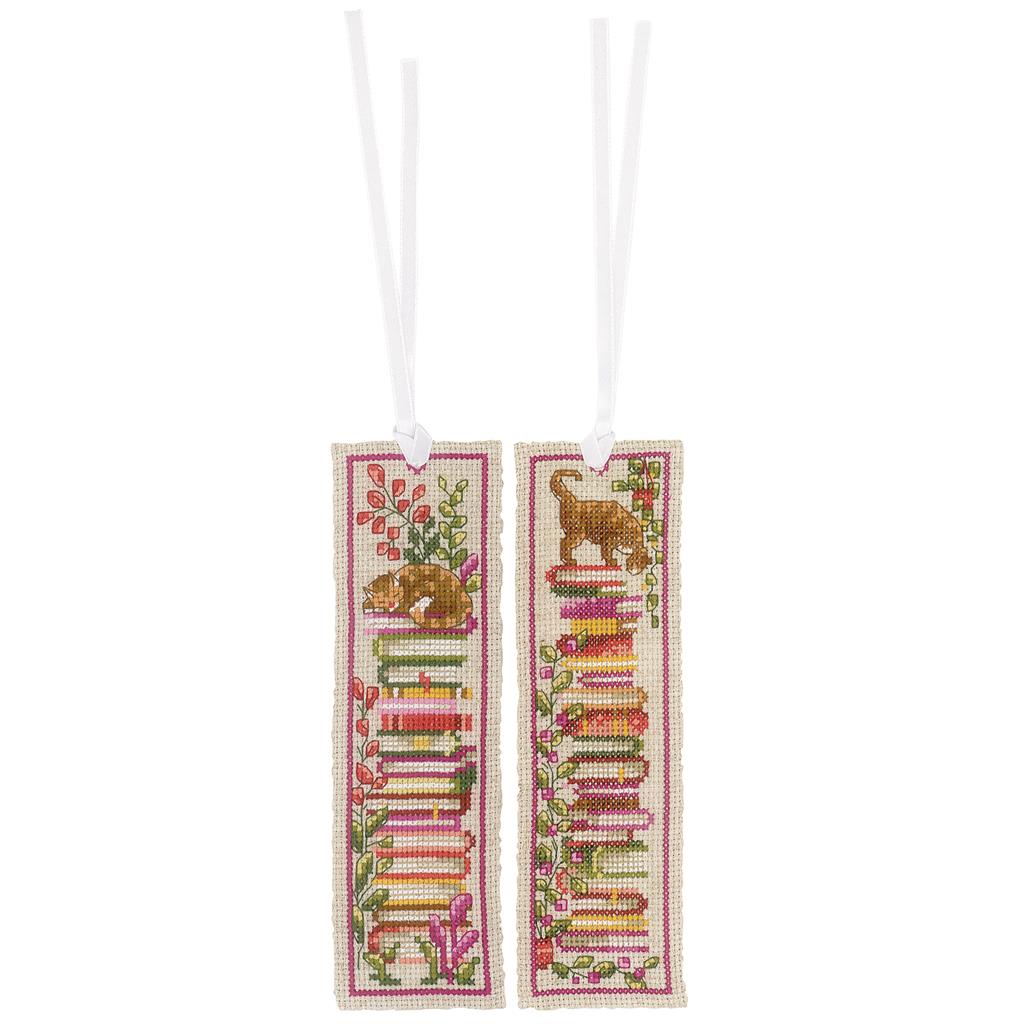 Met dit kleine maar complete boekenlegger borduurpakket maak je niet één maar twee boekenleggers! Beide designs hebben een gezellige uitstraling en zijn perfect voor katten- en boekenliefhebbers.